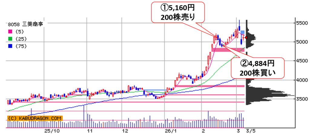 売ったタイミングは、長期高配当株投資をしている自分でも利確したくなる株価だったので、(持っている現物は売らずに)空売りしました。買い戻したタイミングは適当で、十分な利益が乗ったための買い戻しです。